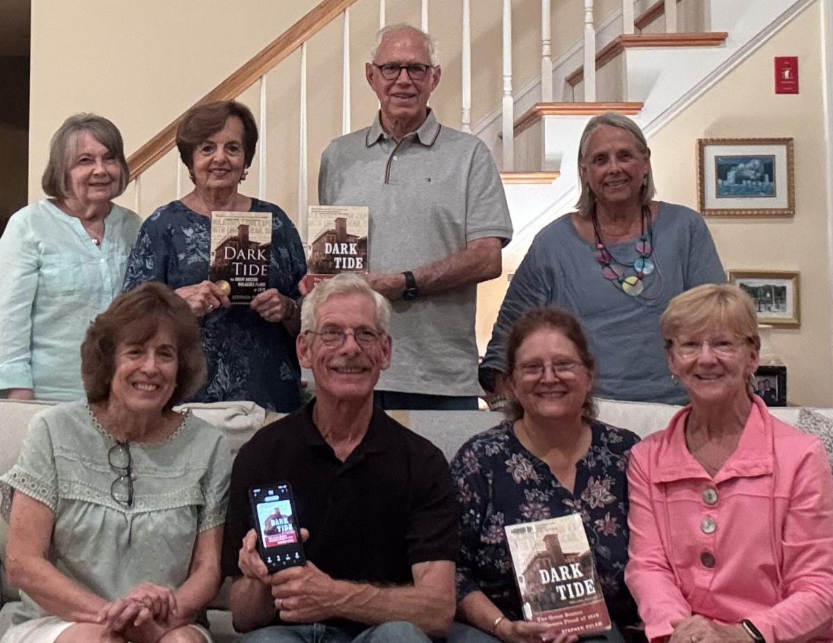 My thanks to the Auburn (MA) Book Club – which has the great acronym “ABC” – for selecting Dark Tide as one of their choices. “I think our discussion was the longest we have ever had,” said member Kathi Giotta. “We were impressed by all of your thorough research and sharing so much history that many were unfamiliar with. Loved your writing style.” So grateful for this club’s kind words! Members are (seated from left): Rachel Lacombe, Dan Donavan, Deb Donavan, and RoxAnn Gusar; (top row from left): Kathi Giotta, a “friend” who prefers not to be identified, Michael Gusar, and Karen Anderson. Members Ray Rieder and Alice Whealan are not pictured. My thanks to the ABC!!
